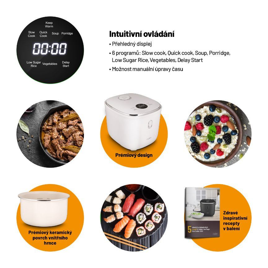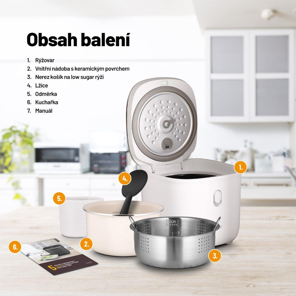 Chcete-li jíst zdravěji, víceučelový rýžovar Lauben Low Sugar Rice Cooker 3000WT vám nesmí chybět. Jeho funkce low sugar zbaví rýži až 40 % sacharidů. Přístroj si poradí se všemi druhy rýže, ale i s dalšími surovinami, například luštěninami. Zvolit můžete ze 6 režimů, které je ale možné ručně upravit. Prémiový nepřilnavý keramický povrch jeho 3l nádoby připraví jídlo pro celou rodinu bez nutnosti použití tuku a obav z připálení. Potěší funkcí Keep Warm, která udrží pokrmy teplé bez nebezpečí rozvaření, odložený start či ochrana proti přetečení a technologie Cool Touch, jejíž zásluhou se o rýžovar nepopálíte. Dotyková tlačítka usnadňují nastavení rýžovaru. Snadná údržba je samozřejmostí, stačí dát vnitřní části do myčky. Pro inspiraci jsme přibalili také kuchařku.
