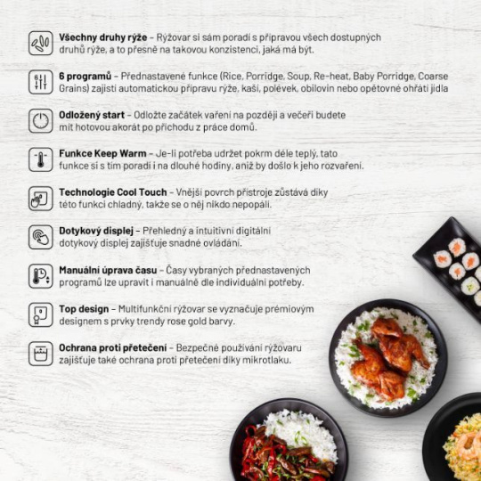Efektivita, snadné použití a design mají společného jmenovatele, je jím víceúčelový rýžovar Lauben Multifunction Rice Cooker 1200WR Rose Gold Edition. Stiskem jediného tlačítka uvaří všechny druhy rýže na správnou tvrdost a 6 přednastavených funkcí vykouzlí další pokrmy jako kaše nebo polévky. Čas některých programů si však na intuitivním dotykovém displeji můžete nastavit i manuálně. Díky funkci odloženého startu lze mít jídlo připraveno už po návratu domů, opozdilci zase ocení funkci Keep Warm, která udrží pokrm teplý bez rozvaření. Porce nasytí jednotlivce i páry, jež pak mají více času pro sebe, protože ani údržba nezabere čas. Vnitřní hrnec lze dát do myčky. Bezpečné používání zajišťuje ochrana proti přetečení a technologie Cool Touch proti popálení. Rýžovar bude ozdobou každé kuchyně, kterou rozzáří trendy rose gold barvou, a přitom nezabere takřka žádné místo.
