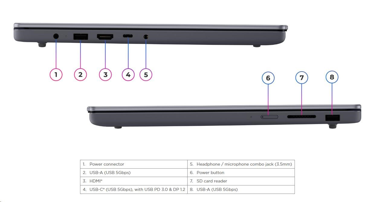 | Standartné porty | 2x USB-A (USB 5Gbps / USB 3.2 Gen 1) 1x USB-C® (USB 5Gbps / USB 3.2 Gen 1), with USB PD 3.0 and DisplayPort™ 1.2 1x HDMI® 1.4 1x Headphone / microphone combo jack (3.5mm) 1x SD card reader 1x Power connector |