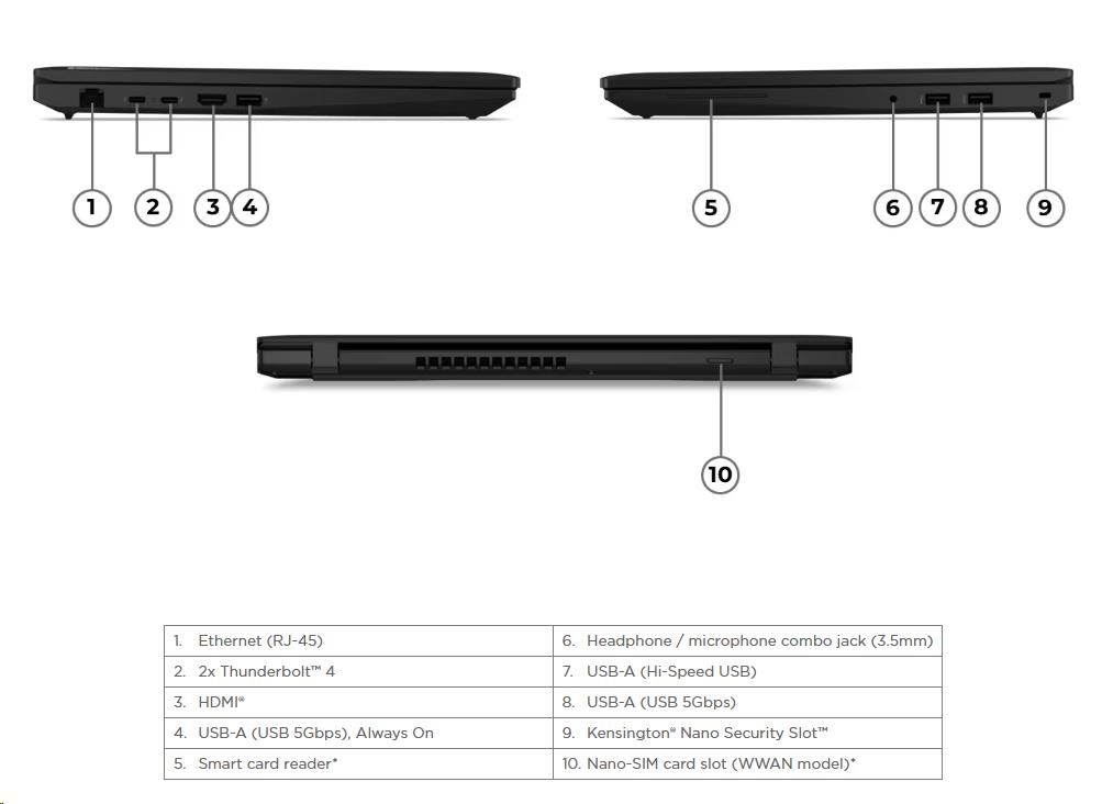 | Standartné porty | 1x USB-A (Hi-Speed USB / USB 2.0) 2x USB-A (USB 5Gbps / USB 3.2 Gen 1), one Always On 2x USB-C® (Thunderbolt™ 4 / USB4® 40Gbps), with USB PD 3.1 and DisplayPort™ 1.4a 1x HDMI® 2.1, up to 4K/60Hz 1x Headphone / microphone combo jack (3.5mm) 1x Ethernet (RJ-45) Optional Ports (configured) 1x Smart Card Reader 1x Nano-SIM Card Slot |