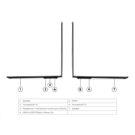 | Standartné porty | 1x USB-A (USB 10Gbps / USB 3.2 Gen 2), Always On 2x USB-C® (Thunderbolt™ 4 / USB4® 40Gbps), with USB PD 3.0 and DisplayPort™ 2.1 1x HDMI® 2.1, up to 4K/60Hz 1x Headphone / microphone combo jack (3.5mm) |