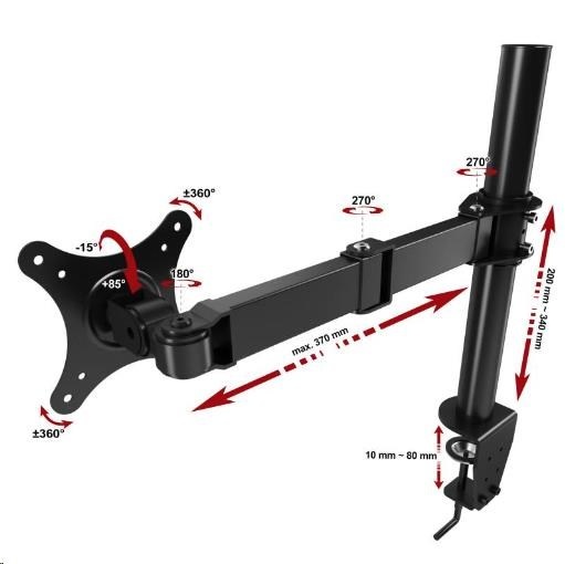 Stolový držák monitoru Ergosolid MD112 I levný držák monitoru může být kvalitní a polohovatelný Nabízíme jeden z nejlevnějších stolních držáků na monitory 14-27", který je opravdu dobré kvality a umožňuje plnohodnotné polohování obrazovky monitoru. Držák umožní s monitorem otáčet do stran, naklápět ho, měnit jeho výšku od stolu, otáčet monitor do horizontální nebo vertikální pozice. Uchycení držáku je možné na veškeré stoly a stolové desky o průměru 10-80mm. Barva černá. Záruka 5 let. Levný stolní držák na monitor 14-27", ideální do kanceláře nebo pracovny - Ergosolid MD112 Technické údaje: nosnost 15kg podpora VESA 75x75 a 100x100 na monitory 14-27" nastavitelná výška držáku 200-340mm maximální délka ramene 370mm otáčení do stran +/- 180° náklon monitoru +15° až -85° rotace monitoru - otočení horizorintálně nebo vertikálně uchycení na okraj stolu na všechny stoly a stolové desky o průměru 10 až 88mm materiál ocel barevné provedení černé záruka 5 let.