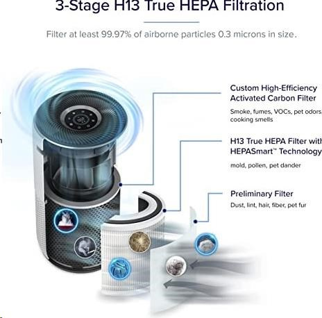 Druhou vrstvou je HEPA filtr H13. To odlišuje Levoit od konkurence, protože filtr HEPA H13 je mnohem kvalitnější a spolehlivější než běžně používané HEPA H11. Tu se odfiltrují jemné prachové částice, plíseň, bakterie, pyl, kouřové částice, roztoče a srst.