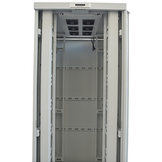 LEXI-Net 19" stojanový rozvaděč 45U 800x800 rozebiratelný, ventilace, termostat, kolečka, 600kg, sklo, rozložený, šedý