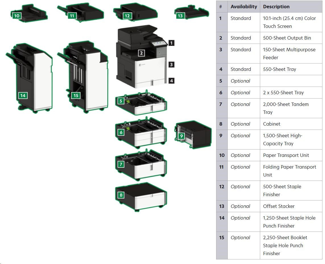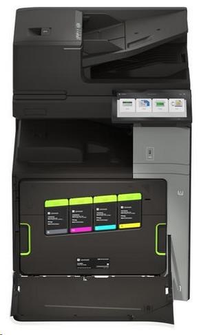 .Part Number 20L8200 Print Technology Color Laser Function Color Copying Color Faxing Color Printing Color Scanning Trusted Platform Module (TPM) The Trusted Platform Module (TPM) is not available in some countries. Workgroup Size Large Workgroup Touch Screen Display Yes Display Lexmark e-Task 10-inch (25 cm) class color touch screen Print Speed (Letter, Black) Up to 35 ppm4 Print Speed (Letter, Color) Up to 35 ppm4 Print Speed (Letter, Black) Duplex Up to 35 spm4 Print Speed (Letter, Color) Duplex Up to 35 spm4 Time to First Page (Black) As fast as 7.1 seconds Time to First Page (Color) As fast as 8.2 seconds Duplex (2-sided) Printing Integrated Duplex Print Resolution, Black 1200 x 1200 dpi 4800 Color Quality Print Resolution, Color 1200 x 1200 dpi 4800 Color Quality Copy Speed (Letter, Black) Up to 35 cpm4 Copy Speed (Letter, Color) Up to 35 cpm4 Copy Speed (Letter, Black) Duplex Up to 35 spm4 Copy Speed (Letter, Color) Duplex Up to 35 spm4 Time to First Copy (Black) As fast as 8.5 seconds Time to First Copy (Color) As fast as 9.5 seconds Reduce / Enlarge Range 25 - 400 % A4/Ltr Simplex Scan Speed (Black) Up to 120/120 sides per minute A4/Ltr Simplex Scan Speed (Color) Up to 120/120 sides per minute A4/Ltr Duplex Scan Speed (Black) Up to 240/240 sides per minute A4/Ltr Duplex Scan Speed (Color) Up to 240/240 sides per minute Scan Area, Maximum 11.69 x 17.0 inches ADF Scan DADF (single pass Duplex) Scanner Type Flatbed scanner with automatic document feeder Scan Resolution, Enhanced 600 x 600 dpi Scan Resolution, Optical 300 x 300 dpi Optical Scanning Resolution 300 X 300 dpi Scan File Formats (Send as) JPEG, JPG PDF Secure PDF TIFF Archival PDF (A-1a, A-1b) Searchable PDF TXT RTF DOCX Scan Destinations e-mail FTP USB Flash drive USB or Network connected computer Processor Speed Quad Core, 1.2 GHz Memory, Standard 4 GB Memory, Maximum 4 GB Hard Disk Intelligent Storage Drive included; Magnetic Hard Disk available Apple Operating Systems Supported Support is provided through AirPrint and AirScan only Citrix MetaFrame Microsoft Windows Server 2012 R2 Datacenter Edition running Citrix XenApp 7.5, 6, 7, 8, 9, 11, 12, 13, 14, 15, 16 Microsoft Windows Server 2012 Datacenter Edition running Citrix XenApp 7.5, 6, 7, 8, 9, 11, 12, 13, 14, 15, 16 Microsoft Windows Server 2012 Foundation running Citrix XenApp 6.0, 6.5 Microsoft Windows Server 2012 Essentials running Citrix XenApp 6.0, 6.5 Microsoft Windows Server 2012 Standard running Citrix XenApp 6.0, 6.5 Linux Operating Systems Supported Ubuntu 20.04 Debian 10 SUSE Linux Enterprise Server 12 SP5 OpenSUSE 15.2 Debian 11 Ubuntu 22.04 Fedora 36 Fedora 37 SUSE Linux Enterprise Server 15 SP4 OpenSUSE 15.4 Red Hat Linux 8.7 Red Hat Linux 9.1 Microsoft Windows Operating Systems Supported Windows Vista Windows Vista x64 Windows Server 2008 Windows Server 2008 x64 Windows Server 2008 running Terminal Services Windows Server 2008 x64 running Terminal Services Windows 7 Windows 7 x64 Windows Server 2008 R2 Windows Server 2008 R2 running Terminal Services Windows 8 Windows 8 x64 Windows Server 2012 Windows 8.1 Windows Server 2012 R2 Windows 10 Windows Server 2016 Windows Server 2019 Windows Server 2022 Windows 11 Novell Operating Systems Supported Novell NetWare 6.5 Open Enterprise Server Novell Open Enterprise Server 2 (SP3) on SuSE Linux Enterprise Server 10 SP4 (x86 and x64) 3 Novell Open Enterprise Server 11 (SP3) on SuSE Linux Enterprise Server 11 SP4 (x86 and x64) Novell Open Enterprise Server 11 (SP3) on SuSE Linux Enterprise Server 12 SP1 (x86 and x64) Novell Open Enterprise Server 15 (SP1) on SuSE Linux Enterprise Server 11 SP4 (x86 and x64) Other Operating Systems Supported Virtually any platform supporting TCP/IP Included Paper Handling 550-Sheet Tray 150-Sheet Multipurpose Feeder 500-Sheet Output Bin Optional Paper Handling 550-Sheet Tray Offset Stacker 500-Sheet Staple Offset Finisher 2 x 550-Sheet Tray 2000-Sheet Tandem Tray Cabinet 1,500-Sheet High-Capacity Tray Paper Transport Unit Folding Paper Transport Unit 1,250-Sheet Staple Hole Punch Finisher 2,250-Sheet Booklet Staple Hole Punch Finisher Paper Input Capacity, Standard Up to 700 pages 20 lb or 75 gsm bond Paper Input Capacity, Maximum Up to 4750 pages 20 lb or 75 gsm bond Paper Output Capacity, Standard Up to 500 pages 20 lb or 75 gsm bond Paper Output Capacity, Maximum Up to 2650 pages 20 lb or 75 gsm bond Paper Weight Range Supported - Standard Tray (lb.) 16 - 80 lb. Paper Weight Range Supported - Multipurpose Feeder (lb.) 16 - 80 lb. A3 / 11 x 17 Yes ADF 300-Sheet Automatic Document Feeder ADF Paper Input Capacity Up to 300 pages 20 lb or 75 gsm bond ADF Paper Output Capacity Up to 300 pages 20 lb or 75 gsm bond Finishing Option Yes Finishing Functions Offset stacking Stapling Hole punching Number of Paper Inputs, Standard 2 Number of Paper Inputs, Maximum 6 Media Types Supported Card Stock Envelopes Glossy Paper Labels Plain Paper Vinyl Labels Refer to the Paper & Specialty Media Guide Media Sizes Supported 10 Envelope 7 3/4 Envelope 9 Envelope A3 A4 A5 B5 Envelope C4 Envelope C5 Envelope DL Envelope Hagaki Card Executive Folio JIS-B4 JIS-B5 Ledger Legal Letter Statement Oficio A6 SRA3 Standard Ports USB 2.0 Specification Hi-Speed Certified (Type B) Gigabit Ethernet (10/100/1000) Front USB 2.0 Specification Hi-Speed Certified port (Type A) 802.11a/b/g/n/ac + Apple iBeacon Optional Local Ports Internal RS-232C serial Internal 1284-B Bidirectional Parallel Optional Network Ports MarkNet N8230 Fiber Ethernet Print Server Direct USB Yes Ethernet Network Yes Wireless Yes Wireless Network WPA2™ - Personal WPA™ and WPA2™ - Personal 802.1x Authentication: MD5, MSCHAPv2, LEAP, PEAP, TLS, TTLS Network Protocol Support TCP UDP IPSEC w/ IPv4 IPSEC w/ IPv6 ICMP IGMP IPv4 IPv6 Network Printing Methods Direct IP (Port 9100) Enhanced IP (Port 9400) FTP IPP 1.0, 1.1, 2.0 (Internet Printing Protocol) Microsoft Web Services WSD Pull Printing Thin Print LPR Network Management Protocols WINS AP