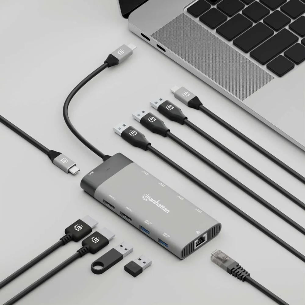 Zvyšte svou produktivitu s počítačem PC, Mac nebo tabletem pomocí této vysoce univerzální dokovací stanice od společnosti Manhattan. Pomůže vám vykonávat více úkolů na dvou UHD HDMI monitorech současně. Většinu potřeb v oblasti konektivity také uspokojíte díky pěti portům SuperSpeed USB-A, které rychle připojují a nabíjejí kompatibilní zařízení, a také portu SuperSpeed USB-C pro přenos dat pro připojení zařízení s vysokou propustností. Přiložený port Ethernet s automatickou detekcí 10/100/1000 vám pomůže připojit se ke kabelové síti a vstup pro napájení až 100 W Power Delivery (PD) pomůže napájet všechna zařízení USB, která se k doku připojí.