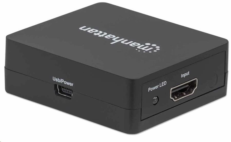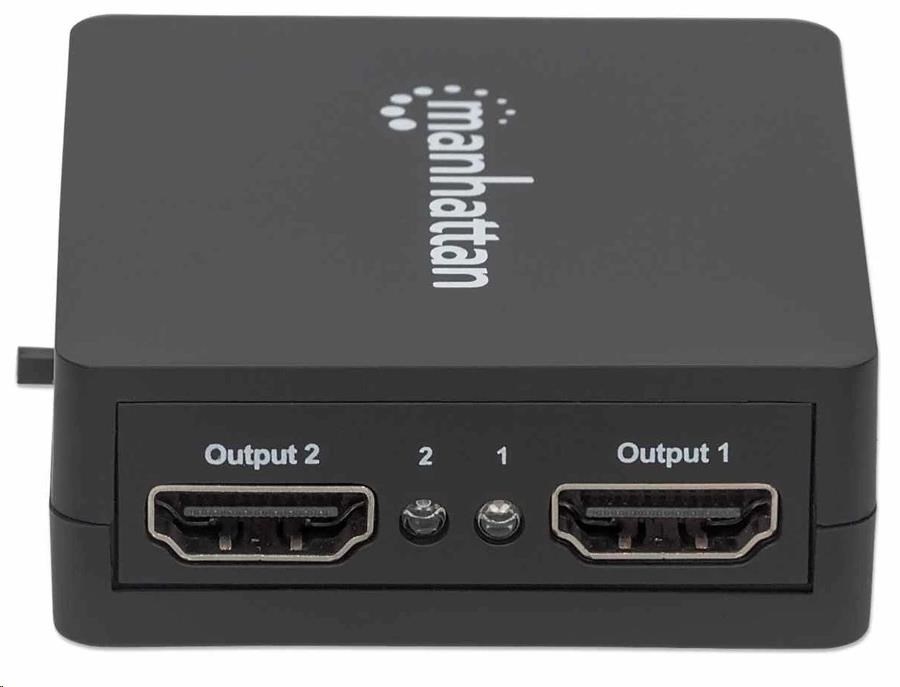 Easily distribute a single HDMI signal to multiple displays.The Manhattan 1080p 2-Port HDMI Splitter sends HDMI signals from a single Blu-ray player, satellite receiver, digital recorder, set-top box, game console or other HDMI source to two HDMI displays. Flexible Solution for Many A/V ApplicationsIdeal for trade shows, classrooms, video conferencing, presentations and retail applications, the Manhattan 1080p 2-Port HDMI Splitter features a built-in booster for added signal strength. It’s also a good choice for splitting and distributing a synchronous signal to multiple HDMI displays when source equipment is remotely stored in a secured room or cabinet. Users can cascade multiple units up to three levels and output HDMI video/audio to additional displays in widely distributed applications.Quality Construction and Easy InstallationFull compliance with HDMI, HDCP 1.0, 1.1 and 1.2 as well as DVI 1.0 ensures that the Manhattan 1080p 2-Port HDMI Splitter can provide long service and reliable performance. Quickly connect HDMI cables (not included) and the USB power cable, and this affordable HDMI solution is complete — no complicated settings or software or hardware configurations necessary.