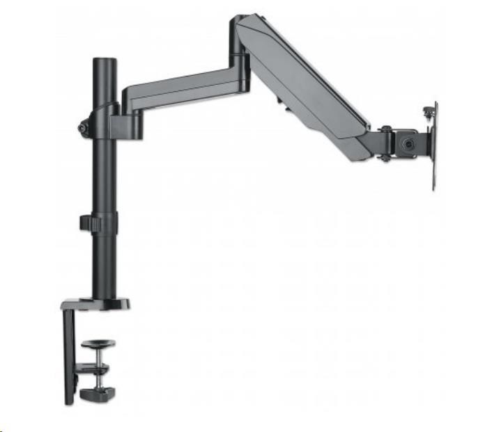 The Manhattan Universal Gas Spring Monitor Mount securely supports one 17" to 32" TV or monitor. Because it uses a gas spring to hold your display, its arm only needs the lightest touch to move your screen to the best viewing angle for you. The mount's high-quality aluminum and steel construction will provide years of reliable service. Ideal for installation on a standard-sized desk, the Manhattan Universal Gas Spring Monitor Mount lets you take advantage of the extra range of movement so you can have more space to get work done.