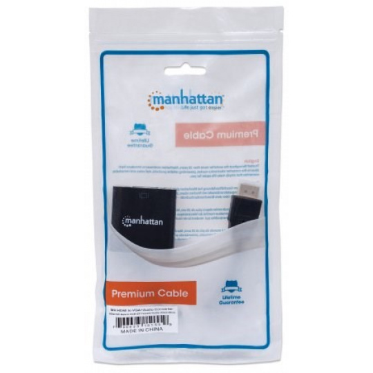 The Manhattan HDMI to VGA Converter helps establish a fast, simple and convenient link between newer HDMI-equipped desktop and notebook computers and other media sources with existing VGA monitors, projectors and other display devices. The Manhattan HDMI to VGA Converter is easy and quick to install and requires no complicated configuration or setup to help extend the service life and fully realize the investment and value of legacy VGA displays, projectors and other equipment. This low-power, cost-effective and reliable solution allows users to transition to HDMI bandwidths, resolutions, Deep Color and more without the expense of upgrading to newer and costly monitors and projectors. Its integrated, all-in-one design helps achieve a compact, integrated solution that eliminates unnecessary cables, tangles and clutter to keep installations and work spaces neat and orderly. Its 3.5mm stereo port allows the converter to transmit audio to an external audio device with convenient, included 3.5mm audio cable, and its Micro-USB port allows for additional power if required.