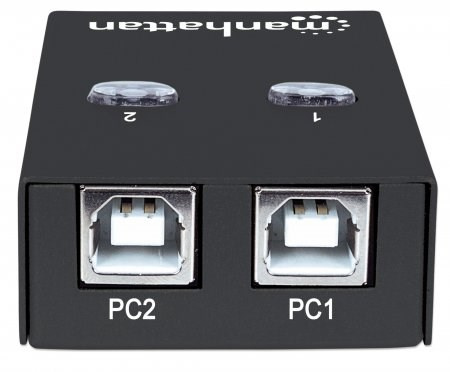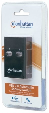 The Manhattan Hi-Speed USB 2.0 Automatic Sharing Switch easily allows two computers to share a USB device. It's ideal for home and office use where users need to share a USB cable modem, printer, digital camera, scanner, external storage drive or other peripheral. Use the convenient access-on-demand switching for activation with a single click of an onscreen button, or use on-board switches to manually select an active computer.