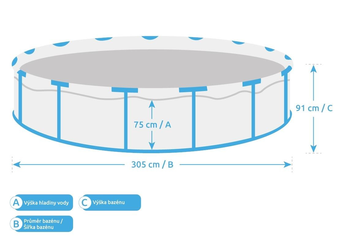 Uvedené rozměry bazénu jsou pouze orientační a ovlivnit je může rovnost podkladu či objem napuštěné vody. Povolená výrobní odchylka je 5 %.