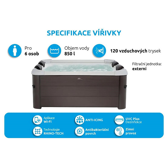 | Funkce vířivky | UV dezinfekce vody; Ovládání mobilní aplikací; Možnost provozu v zimě; Antibakteriální povrch |