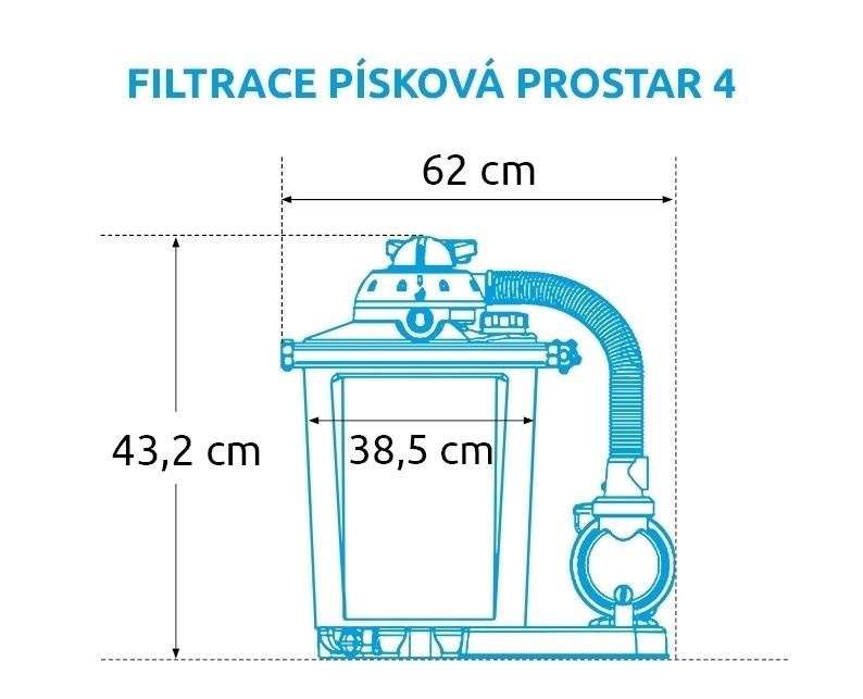Filtrační systém pískové filtrace ProStar 4 se skládá z filtrační nádoby, do které se vejde 16 - 17 kg filtračního písku. Nádoba je vyrobena z vysoce kvalitního polypropylenu (PP). Je beze švů, odolává korozi a běžně dostupným chemikáliím používaných v bazénech.
