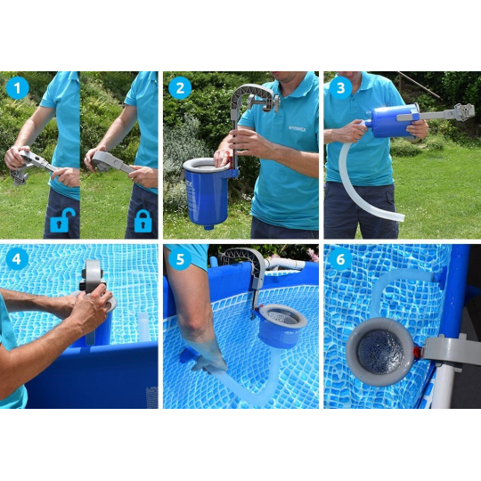 Skimmer pro sběr nečistot z hladiny bazénu. Skimmer se napojí na průchod stěnou bazénu pomocí šroubového adaptéru a hadice a zavěsí se na stěnu nebo límec bazénu. V balení jsou adaptéry pro zavěšení na bazény s nafukovacím lemem a na bazény s kovovým rámem. Montáž je velmi jednoduchá a zvládne ji prakticky každý. Díky skimmeru se z hladin stahují nečistoty, které potom zachytí filtrace.