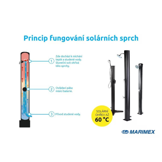 Zajistí ohřev vody přiváděné ze zahradní hadice a tím perfektní pocit pohodlí při sprchování teplou nebo vlažnou vodou. Ohřev vody zajišťuje sluneční záření a tělo sprchy, které funguje jako solární kolektor.