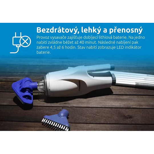Vysavač velmi účinně vysává až do hloubky 2 metrů. Zachytí jemné i hrubé nečistoty, od zákalů přes listy až po písek. Nečistoty se zachytávají ve filtru, ze kterého se po vysávání snadno vysypou ven. Kapacita sběrné nádoby je 0,42 litrů. Balení vysavače obsahuje otočnou sací hlavu, která je vhodná na větší plochy. Zároveň obsahuje plochý kartáč, ten usnadní vysávání rohů.