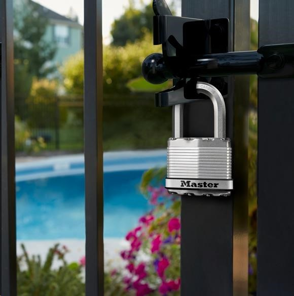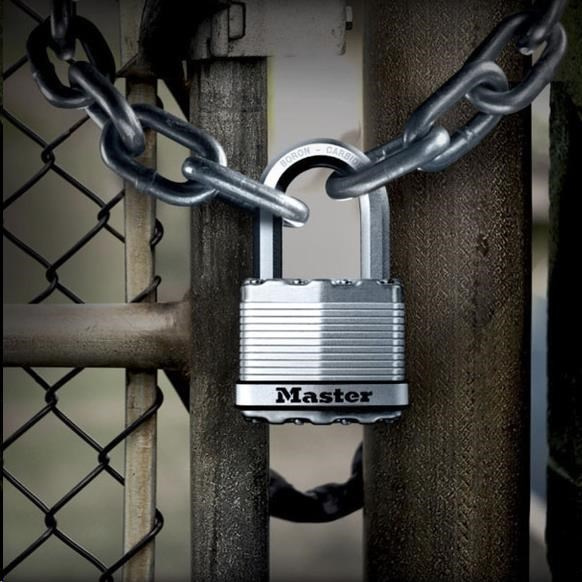 - Visací zámek o šířce 64 mm s tělem z vrstvené oceli zpevněný titanem pro vyšší odolnost a spolehlivost.