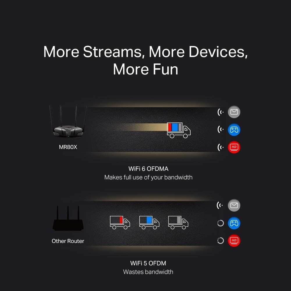 • Více zařízení, více zábavy – podporuje technologie MU-MIMO a OFDMA, které snižují zahlcení sítě a čtyřnásobně zvyšují průměrnou propustnost.