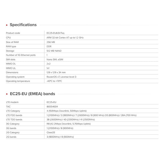 Cenově výhodné venkovní LTE zařízení s integrovanou směrovou anténou 2×2 MIMO. Mikrotik nabízí řešení pro spolehlivý a cenově dostupný způsob, jak se připojit k internetu. EU model SXTsq Embedded LTE4 (EC25-EU) Optimalizován pro sítě v regionu EMEA, podporuje nejběžnější LTE pásma používaná v Evropě a sousedních regionech. Zařízení SXTsq Embedded LTE4 je navrženo pro praktické připojení v domácnostech na venkově, chatách, staveništích a podobně odlehlých místech. Jednoduše externě nainstalujte, nasměrujte na nejbližší vysílač a získejte spolehlivé LTE připojení. Integrovaná směrová anténa zlepšuje kvalitu a stabilitu signálu. SXTsq Embedded LTE4 je vybaven modemem Cat4 LTE, integrovanou směrovou anténou 2×2 MIMO, rychlým procesorem ARM, 256 MB RAM. Disponuje vstupem PoE (12–57 V) a odolným krytem s krytím IP67 – vše s operačním systémem RouterOS v7 a max. spotřebou pouhých 5 W. Zařízení obsahující operační systém RouterOS v7 nabízí kompletní síťový konfigurační komfort včetně: • pokročilé směrování • podporu firewallu a VPN • vzdálenou správu • řízení a monitorování provozu • automatizaci a skriptování eSIM + Nano SIM – ještě jednodušší připojení Zařízení SXTsq Embedded LTE4 přináší podporu eSIM do této oblíbené platformy pro venkovní použití. Aktivujte datový tarif na dálku a připojte zařízení k internetu bez nutnosti manipulace s fyzickými SIM kartami. To je užitečné zejména při vzdálených nasazeních, záložních připojeních a rozptýlených instalacích. Pro větší flexibilitu je zařízení vybaveno také slotem pro Nano SIM, což vám v případě potřeby umožní využívat služeb tradičních mobilních operátorů. Rychlé nasazení, flexibilní připojení – přesně to, co moderní sítě vyžadují. Technické specifikace: Product code: EC25-EU&SXTsq CPU: ARM 32-bit Cortex A7 up to 1.2 GHz Size of RAM: 256 MB RAM type: DDR Storage: 512 MB NAND Number of 1G Ethernet ports: 1 SIM slots: Nano SIM, eSIM MIMO DL: 2x2 MIMO UL: 1x1 Dimensions: 129 x 129 x 34 mm Operating system: RouterOS v7, License level 3 Operating temperature: -40°C to +70°C Podporovaná pásma: LTE modem: EC25-EU TAC: 86554604 LTE Category: 4 (150Mbps Downlink, 50Mbps Uplink) LTE FDD bands: 1 (2100MHz) / 3 (1800MHz) / 7 (2600MHz) / 8 (900 MHz) /20 (800MHz) / 28A (700 MHz) LTE TDD bands: 38 (2600MHz) / 40 (2300MHz) / 41 (2500MHz) 3G Category: R8 (42.2Mbps Downlink, 5.76Mbps Uplink) 3G bands: 1 (2100MHz) / 8 (900MHz) 2G Category: Class33 2G bands: 3 (1800MHz) / 8 (900MHz) Napájení: DC input: PoE-In PoE-In input Voltage: 12-57 V Power adapter nominal voltage: 24 V Power adapter nominal current: 0.38 A PoE-in: 802.3af/at Max power consumption: 5 W Upozornění: Výrobce Mikrotik neposkytuje záruku na zařízení poškozená přepětím. Zařízení je třeba adekvátně chránit proti indukovanému elektrostatickému přepětí či přepěťovým špičkám na silovém vedení. Pro venkovní instalace používat výhradně stíněnou kabeláž (FTP/SFTP) a jednotky korektně uzemnit (prostřednictvím integrovaného zemnícího členu či použitím ethernetové přepěťové ochrany)..