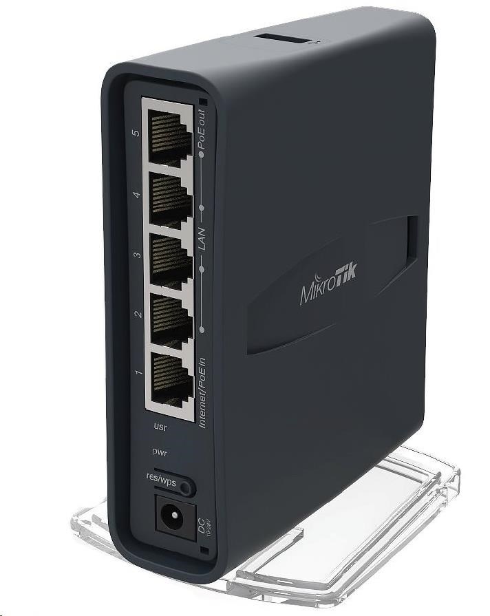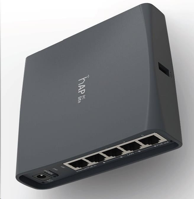 hAP ac lite je nový kompaktní router podporující standard 802.11ac. Je integrována jak 2.4GHz tak 5GHz Wi-Fi. (2.4GHz využívá 802.11b/g/b, dual chain 1.5dBi anténa, 300Mbps / 5GHz jede na 802.11ac a nechybí ani zpětná kompatibilita s 802.11a/n., single chain - 2dBi anténa, 433Mbps). Tato duální wifi tak dosahuje celkových přenosových rychlostí až 733Mbps. Procesor je taktován na 650MHz a sekunduje mu 64MB RAM operační paměti typu DDR. K dispozici je celkem pět ethernetových portů 100Mbps s podporou PoE in(port1) taktéž out (port5).