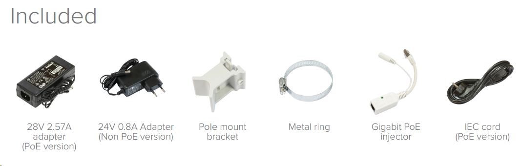 Balení obsahuje: OmniTIK PG-5HacD, PoE injektor, napájecí zdroj, montážní sada na stožár