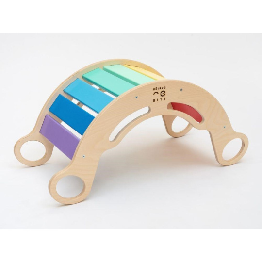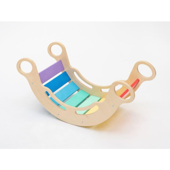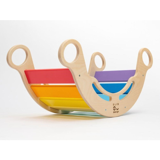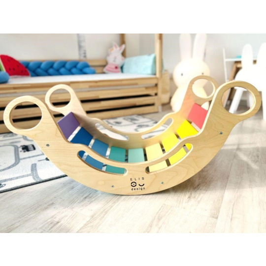 Velice kvalitní, bezpečná, hravá a vylepšená Montessori duhová houpačka 5in1 od ELIS DESIGN v úžasných svěžích, pestrých barvách, podpoří správný motorický rozvoj vašeho dítěte. Její všestranné využití umožní dětem používat houpačku nejen k houpání, ale i jako skluzavku, skrýš, prolézačku nebo sedačku. Houpačka (rainbow rocker) je vyrobena z těch nejkvalitnějších materiálů, ručně dohladka opracovaná a poctivě lakovaná barvami s atestem. Krásně barevná dřevěná houpačka je vhodná pro děti od 1 do 6 let..