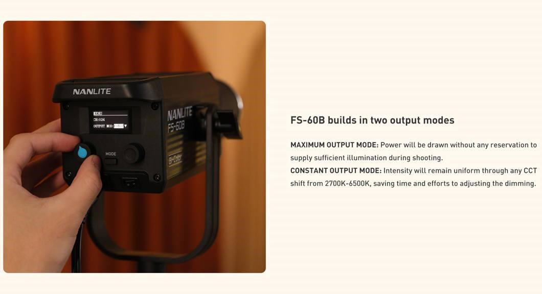 Model FS-60B je vybaven 1,3" OLED displejem pro přímé, přesné a snadné ovládání. Lze jej ale také ovládat vzdáleně prostřednictvím Bluetooth a aplikace NANLINK, která je zdarma a je určena pro systémy iOS i Android, pomocí 2.4GHz připojení s využitím samostatně dostupného manuálního dálkového ovladače WS-RC-C2 nebo boxu vysílače WS-TB-1.