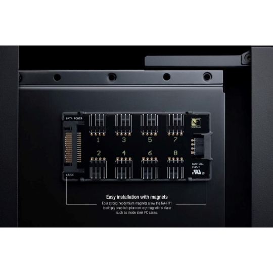 NA-FH1 je vysoce kvalitní, chytře chráněný 8kanálový rozbočovač ventilátorů PWM, který umožňuje spustit a ovládat až osm ventilátorů PWM současně prostřednictvím jediné hlavičky ventilátoru PWM na základní desce nebo samostatných regulátorů, jako je volitelný NA-FC1. Ventilátory bez PWM lze ovládat nastavením vstupního napětí. Díky podpoře 12V i 5V ventilátorů se 4pólovými PWM a 3pólovými konektory je NA-FH1 vysoce flexibilní a vhodný jak pro prostředí PC, tak pro další aplikace založené na 12V nebo 5V. Může být napájen buď přes vstup S-ATA (pro 12V ventilátory, až 54 W), nebo přes 4pinový vstup PWM (pro 5V a 12V ventilátory, až 24 W), přičemž oba jsou chráněny proti nadproudu samonastavovací pojistkou pro maximální bezpečnost i v případě zkratu na připojených zařízeních nebo kabelech.