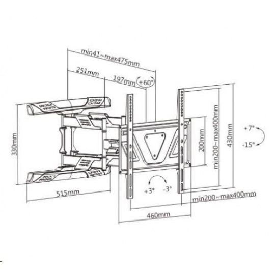 Špičkový nástěnný držák s polohováním Tv 32-80", otočný, sklopný, výsuvný Nástěnný držák na televize, který vyniká skvělou nastavitelností, výbornou konstrukcí a krásným dizajnem. Vhodný je na všechny typy a značky televizí, jejichž hmotnost není vyšší jak 45kg a které podporují VESA standardy od 200x200 do 400x400. Unikátní konstrukce držáku umožňuje zasunutí televize ke zdi na vzdálenost pouhých 41mm a maximální vysunutí až na vzdálenost 475mm. Otáčení je možné na obě strany minimálně o 60°, náklon je solidních 15° dolů nebo 7° nahoru. Držák podporuje korekci roviny obrazovky, konstrukce je osazena kryty pro vedení kabeláže. Držák Fiber Mounts Super-2 doporučujeme i náročným uživatelům, díky své kvalitě, dizajnu, nastavitelnosti, kvalitnímu zpracování a dostupné ceně je dostupný téměř každému. Fiber Mounts Super-2 je špičkový držák na televize 37-80" za skvělou cenu, vhodný nejen pro náročné uživatele Technické údaje: nosnost 45kg podpora VESA standardu 200x200 až 400x400 vhodný na televize s úhlopříčkou 32" až 80" výsuvný, nastavení vzdálenosti od zdi 41mm až 475mm otočný do stran, minimálně +/- 60° náklopný, směrem dolů až o 15°, nahoru až o 7° korekce roviny obrazovky +/- 3° ultra tenká, silnostěnná konstrukce vynikající bezpečnost a stabilita bez prověšení ramen i při maximálním zatížení a maximálním vysunutí krásný dizajn krytky pro vedení kabeláže barevné provedení černé záruka 5 let Nástěnný výsuvný ultraslim držák na Tv Fiber Mounts Super-2 podporuje VESA standardy: VESA 200x200 VESA 300x200 a 200x300 VESA 300x300 VESA 400x200 a 200x400 VESA 400x300 a 300x400 VESA 400x400.