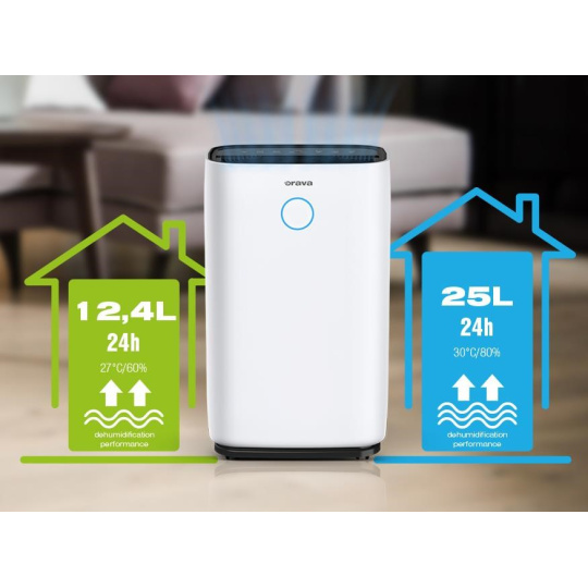 Vysokého výkonu dosahuje při pokojové teplotě 30 °C a 80% relativní vlhkosti, kdy ze vzduchu odsaje až 25 l za 24 hodin, při pokojové teplotě 27 °C a 60% relativní vlhkosti odsaje 12,4 l za 24 hodin. Objem zachycené nádoby na vodu je 4 l. Po naplnění této nádržky se odvlhčovač automaticky vypne. Nepřetržitý provoz je umožněn stálým odtokem vody pomocí hadice, která je součástí balení. Samozřejmostí je 12hodinový časovač, kde si můžete nastavit dobu provozu podle svých potřeb.