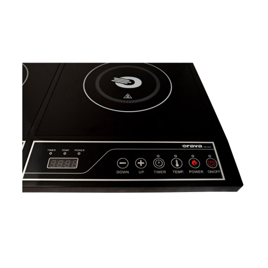 Indukční vařič Orava. Indukční vařič VP-40i se dvěma varnými zónami, které tvoří elegantní černé sklo s velmi jednoduchou údržbou. Přehledné dotykové ovládání umožňuje osm úrovní nastavení teploty od 60°C do 240°C. Časovač, LED displej.