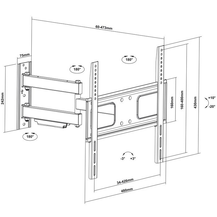Otočný, sklopný a délkově stavitelný držák Tv Fiber Mounts M64C7 Závěsný systém na rovné i prohnuté obrazovky do 70", otočný, sklopný, délkově nastavitelný, VESA 200x200 až 400x400, nosnost 50kg Potřebujete kvalitní otočný, sklopný a délkově nastavitelný držák na klasickou rovnou nebo prohnutou televizi? Nechcete zaplatit víc než je nutné? Máme pro Vás ideální řešení - držák na Tv Fiber Mounts M64C7. Otočné, sklopné a délkově nastavitelné rameno umožní nastavení obrazovky právě do polohy, kterou požadujete. Dívání na televizi je pak podstatně příjemnější a pohodlnější. Na držáku je i krytka pro uchycení kabeláže. Pokud nejste zrovna profesionální montér, jistě oceníte možnost korekce roviny obrazovky i po ukotvení držáku do zdi. Dodáváme v černém provedení společně s montážním materiálem. Kvalitní výsuvný otáčecí a náklopný držák na rovné i prohnuté televize do 65" Fiber Mounts M64C7 Držák na rovné i curved televize Fiber Mounts M64C7 Technické údaje: nosnost 50kg podporuje VESA standardy 200x200 až 400x400 na prohnuté i klasické rovné obrazovky doporučujeme na Tv s úhlopříčkami 43" až 70" nastavení vzdálenosti 60 až 473mm nastavení náklonu obrazovky +10° až -20° otočný do stran až +90° / -90° korekce roviny obrazovky +3° až -3° masivní kovová konstrukce krytka pro uchycení kabeláže vysoká kvalita zpracování barva černá záruka 3 roky Fiber Mounts M64C7 je kvalitní vysouvací držák na rovné a prohnuté LCD LED OLED QLED televize, snadné otáčení Tv do stran a naklopení dolů nebo nahoru, nosnost 50kg Držák podporuje VESA standardy pro uchycení: VESA 200x200 VESA 300x200 a 200x300 VESA 300x300 VESA 400x200 a 200x400 VESA 400x300 a 300x400 VESA 400x400 Nástěnný držák Fiber Mounts M64C7 je vhodný pro zavěšení všech typů a velikostí televizorů, které mají hmotnost do 50kg a které podporují některý z výše uvedených VESA standardů. Na velikosti televize nezáleží, udávané úhlopříčky jsou pouze informativní..