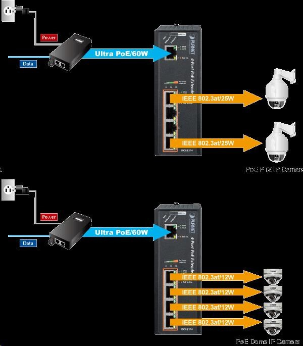 Průmyslový Power over Ethernet extender IEEE 802.3at se 4-portovým gigabitovým přepínačem a injektory pro další napájení zařízení po ethernetu. Injektory lze zatížit do 60W v kombinaci 2x 802.3at zařízení po 30W nebo 4x 802.3af zařízení po 12W. Designovaný pro použití s kamerami PTZ, dotykovými monitory, VoIP aparáty nebo WiFi přístupovými body v terénu a na težko dostupných místech. Provoz extenderu je možný při teplotách od -40 do 75°C, je odolný vůči vibracím, přetížení a externím mechanickým vlivům; všechny porty obsahují ESD+EFT ochranu proti přepětí a elektrostatice. Extender se napájí přímo pomocí PoE UltraPower injektorem (60W) Planet POE-171 nebo POE-173! Parametry: - Ethernet rozhraní: 1x napájecí PoE vstup (Ultra Power 60W); 4x injektory - celková zatížitelnost inejktorů 60W (2x 30W nebo 4x 12W) - slučitelné s IEEE 802.3u, IEEE 802.3ab 1000Base-T, IEEE 802.3af, IEEE 802.3at - instalace na DIN lištu nebo na zeď, montážní díl součástí - krytí IP30, skříň celohliníková - zařízení je odolné proti pádu (IEC-60068-2-32) z výšky 75cm na všechny dopadové části - zařízení je odolné proti vibracím (IEC-60068-2-6) 10-500-10Hz, 4x g, 0,5oct/min - zařízení je odolné proti přetížení krátkodobému zrychlení 50x g, dlouhodobému 4x g (IEC-60068-2-27) - integrována ochrana EFT/ESD proti zavlečení cizího napětí a proti rychlým přechodovým jevům do 6KV DC - EMI/EMS, elektromagnetická kompatibilita a slučitelnost dle CE EN-6100-4-2,3,4,5,6 - elektrická bezpečnost dle CE EN-60950 - LED indikace zatížení - pracovní teplota -40 až 75°C, vlhkost do 95% - rozměry: 135 x 87.8 x 56 mm - hmotnost 715g - napájení PoE IEEE 802.3at, 60W UltraPower injektorem (Planet POE-171 nebo POE-173).