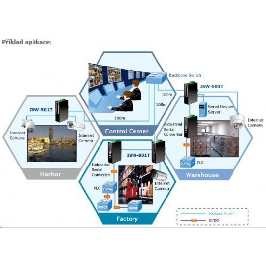 Planet ISW-501T, 5x 10/100, DIN,IP30, rozšířený teplotní rozsah -40~75 st.C Přepínače pro průmyslový Ethernet jsou určeny do náročných provozních podmínek s velkým rozsahem pracovních teplot, nejistým napájením a častými otřesy. Přepínače řady ISW se snadno instalují na standardní DIN lištu nebo přímo na zeď a umožňují nasazení dobře známé Ethernetové technologie i v průmyslovém prostředí. Stejně tak jsou vhodné pro instalace do venkovně umístěných skříní s velkým kolísáním pracovních teplot (typicky bezdrátové a MAN ISP aplikace). Vlastnosti: 5 portů 100 Base-TX, Switching, Full Duplex (100/200 Mbps), Auto-Negotiation (10/100 Mbps) 2k MAC adres automatická detekce přímý/křížený kabel na každém portu pole LED indikátorů pro diagnostiku provozu instalace na DIN lištu, montážní díl součástí instalace na zeď, montážní díl součástí krytí IP30, skříň celohliníková napájení: 12-48V DC redundantní, připojení možné ze dvou různých zdrojů (nejsou součástí balení) ochrana proti přepólování, připojení napájení na svorkovnici, umístění na spodním panelu (nepřekáží při montáži na zeď) zařízení je odolné proti pádu (IEC-60068-2-32) z výšky 75cm na všechny dopadové části zařízení je odolné proti vibracím (IEC-60068-2-6) 10-500-10Hz, 4x g, 0,5oct/min zařízení je odolné proti přetížení krátkodobému zrychlení 50x g, dlouhodobému 4x g (IEC-60068-2-27) EMI/EMS, elektromagnetická kompatibilita a slučitelnost dle CE EN-6100-4-2,3,4,5,6 elektrická bezpečnost dle CE EN-60950 pracovní teplota -40 až 75 st. C, vlhkost do 90% příkon 11W hmotnost: 438g rozměry: 135 x 87 x 32 mm.