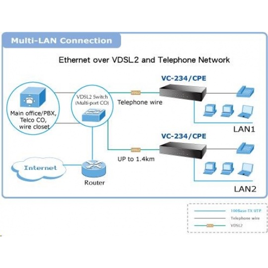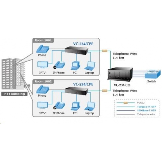Planet VC-234, Eth. VDSL2 konvertor, 100Mbit, master/slave, 2x RJ-11, splitter, 4x RJ-45
