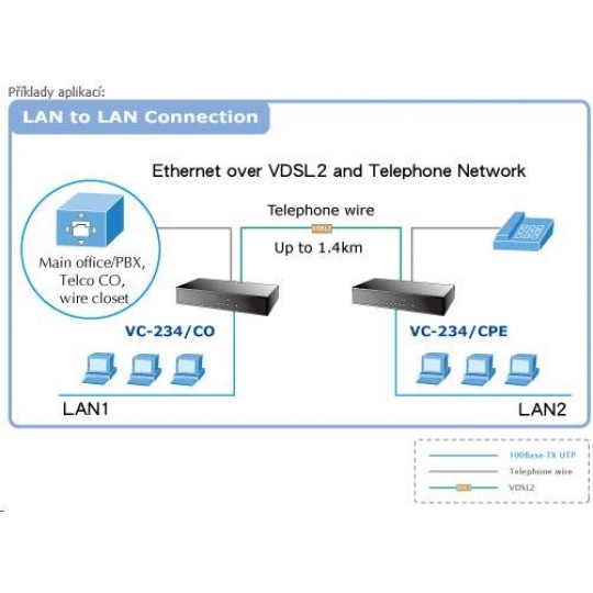 Ethernet po telefonním vedení (technologie VDSL2). 4x LAN RJ-45, 2x RJ-11 konektor pro VDSL2 a POTS. 100/100Mbps na 300m.Transparentní bridge. Dosah až 1,4km. Nastavení DIP přepínači. Volitelně Master (CO) / Slave (CPE). Vestavěný splitter. Výkonný LRE (Long Reach Ethernet) konvertor ethernetu na VDSL2 (Very-high-data-rate Digital Subscriber Line 2) dovoluje přenést data symetrickým párem vodičů rychlostí až 100Mbitů/s na 300m nebo 20/4Mbps do vzdálenosti až 1,4km. Integrovaný splitter zachová hlasovou službu na telefonním vedení bez další úpravy zapojení, datový provoz se jednoduše přidruží k existujícímu hlasovému. S výhodou tak lze využít telefonní kabelová vedení původně určená pro spojení nejenom k účastníkům ale i mezi analogovými ústřednami. ISP (internet service provider) je tak umožněno nabízet multimediální služby, VOD (video on demand), VoIP (voice over IP), Video phone, IPTV, apod. Zařízení je univerzální jako master (CO) / slave (CPE) jednotka, nastavení režimu přepínačem. Jednotka podporuje VDSL2 operační módy "17a" a "30a" a také "band Plan997" postihující symetrický přenos dat vyšší rychlostí. Vlastnosti: - 2x port RJ-11 pro VDSL a POTS (Plain Old Telephone Service) - 4x LAN 10/100Base-TX, Switching, Full Duplex (100/200 Mbps), Auto-Negotiation (10/100 Mbps) - transparentní pro IEEE 802.1Q VLAN tag - parametry nastavované DIP přepínači na zařízení: volba CPE/CO, volba modulace, volba komunikačního limitu, volba SNR - podpora standardů: IEEE 802.3, 10Base-T, IEEE 802.3u, 100Base-TX, IEEE 802.3x - splňuje VDSL standardy ITU-T G.993.1, ITU-T G.997.1, ITU-T G.993.2 - rozměry: 155 x 86 x 26mm - hmotnost: 368g - externí zdroj 5V/2A - provozní teplota okolí: 0 až 50°C Dosahy a rychlosti na vedení s vodiči AWG24 a lepších: > 17a profile (Downstream / Upstream) - 200m -> 99/70Mbps - 400m -> 99/60Mbps - 600m -> 90/45Mbps - 800m -> 50/28Mbps - 1000m -> 40/12Mbps - 1200m -> 20/7Mbps - 1400m -> 20/4Mbps > 30a profile (Downstream / Upstream) - 300m -> 100/100Mbps - 400m -> 90/90Mbps - 600m -> 69/55Mbps - 800m -> 48/9Mbps.