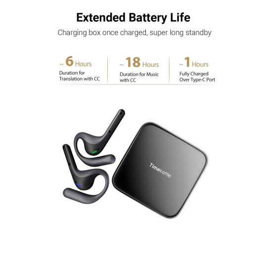 Praktické nabíjecí pouzdro zajišťuje, že budete mít sluchátka vždy připravená k použití. Na jedno nabití vydrží až 6 hodin nepřetržitého tlumočení, takže zvládnete i dlouhá jednání bez přerušení. Pro poslech hudby nabízí až 12 hodin přehrávání. Stylové a kompaktní pouzdro usnadní přenášení i dobíjení kdykoliv na cestách.