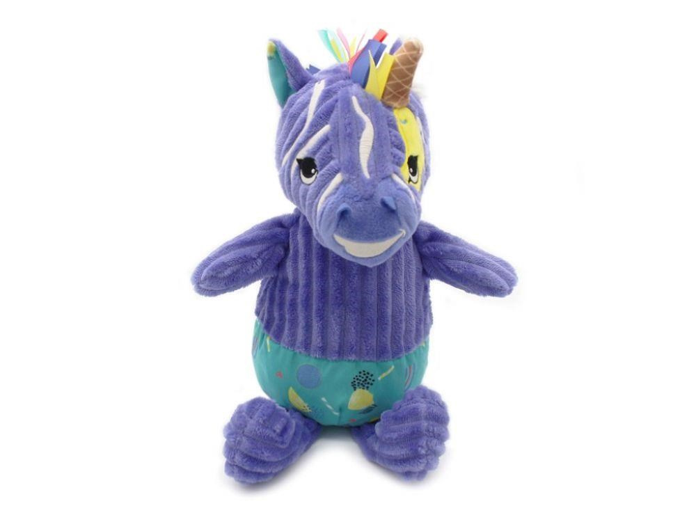 Roztomilý plyšák v podobě zebry, v krásné fialové barvě, je originálním dárkem k jakékoliv příležitosti. Úžasně heboučké plyšové zvířátko ušité z měkoučkého manšestru, ozdobené barevnými stuhami, je ideálním společníkem do postýlky nebo kolébky, do kočárku i na cesty. Plyšovou zebrou v dárkové krabičce a pokladničce můžete obdarovat miminko i větší slečnu..