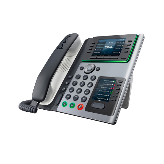 AudioPoly HD Voice; Technologie Poly Acoustic Clarity zajišťuje plně duplexní hovory a potlačuje akustickou ozvěnu i okolní šum; Technologie Poly Acoustic Fence potlačuje okolní hluk při použití sluchátka nebo kabelové náhlavní soupravy; Technologie Poly NoiseBlockAI odstraňuje většinu okolního hluku při používání konferenčního reproduktoru; Aplikace Poly Computer Audio Connector nainstalovaná v počítači (pouze Windows) umožňuje vybrat telefon pro zvukový vstup a výstup počítače a použít s počítačovými aplikacemi sluchátka, volitelné náhlavní soupravy a handsfree hlasitého odposlechu; Design s vylepšenými basy; Širokopásmový zvuk TIA-920, v souladu s typem 1 (plně duplexní IEEE 1329); Individuální nastavení hlasitosti s vizuální zpětnou vazbou pro každou zvukovou cestu; Detekce hlasové aktivity; Komfortní tvorba hluku; Generování tónů DTMF (RFC 2833 a v pásmu); Přenos zvukových paketů s nízkým zpožděním; Adaptivní paměti pro vyrovnání zpoždění