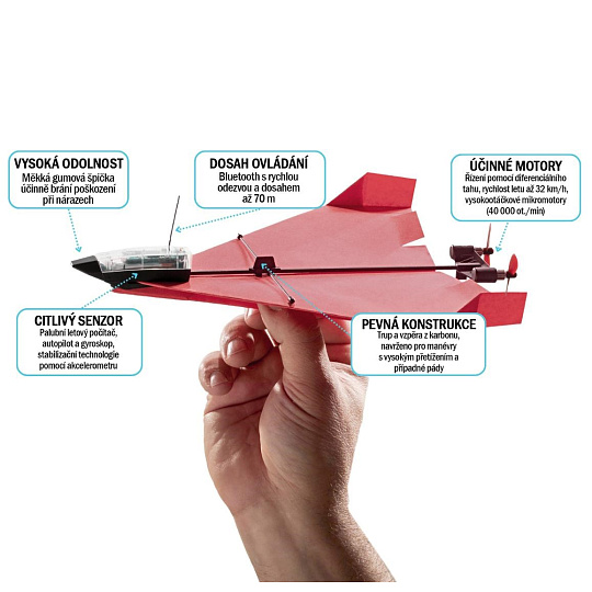Rychloupínací systém umožňuje experimentovat nejen s obyčejným papírem, ale i s lehkým kartonem, balzovým dřevem nebo pěnovými materiály. Palubní počítač navíc sám dorovnává drobné nepřesnosti ve skládání, takže i úplní začátečníci zažijí hladký let hned na první pokus.