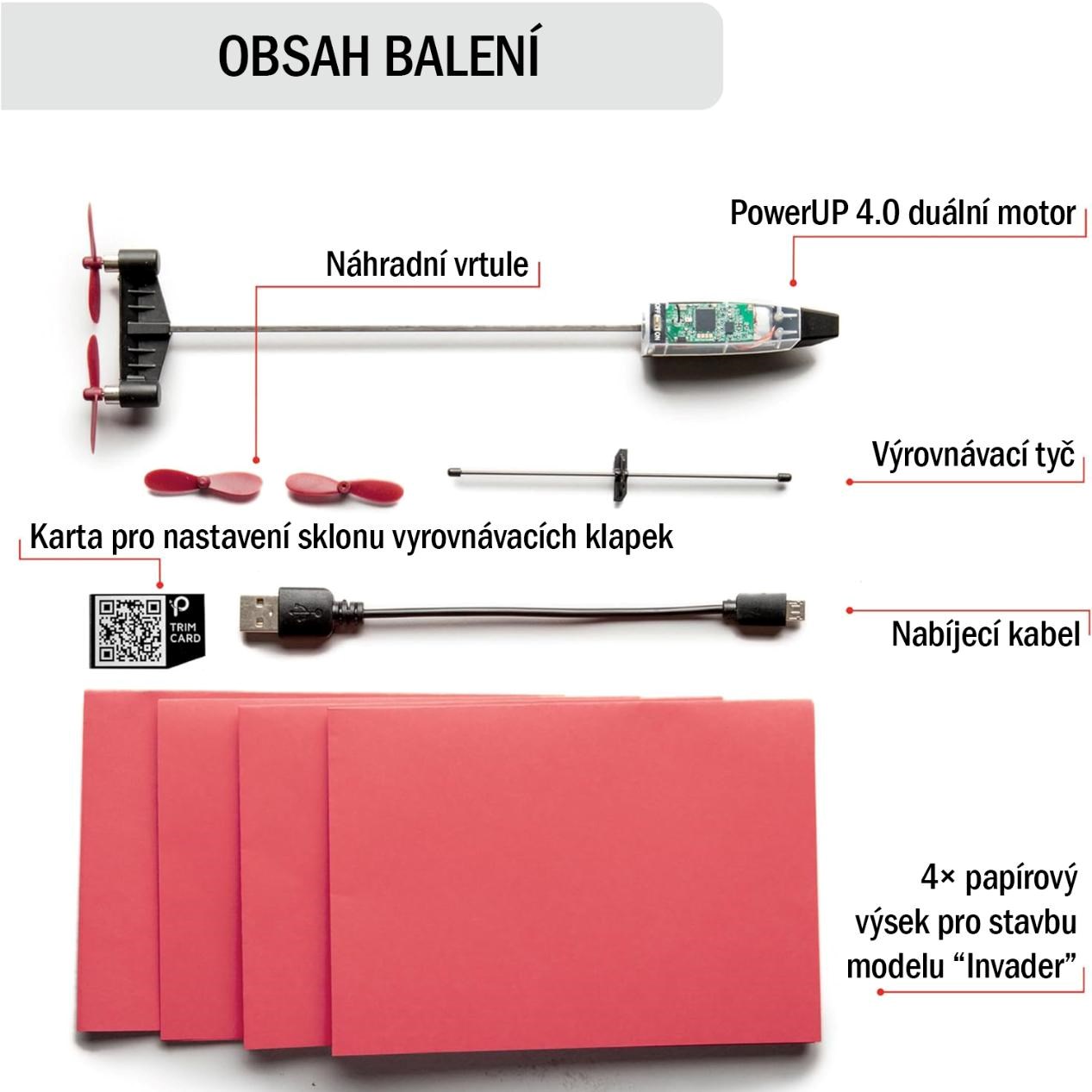 Základní balení obsahuje chytrý duální motor PowerUp 4.0, nabíjecí kabel, náhradní vrtule, křížovou vzpěru, kartičku pro vyladění sklonu klapek a sadu archů. Celý set tak funguje jako fantastický dárek, u kterého malí i velcí piloti najdou vše potřebné k okamžitému startu.