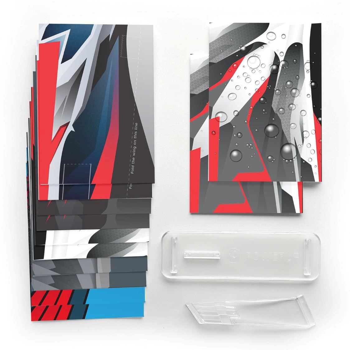 Balíček dvanácti precizních archů přináší agresivní vzhled a 6 odlišných aerodynamických tvarů, se kterými posunete manévrovatelnost svého letadla o úroveň výš. Ty nejpovedenější kousky si po letu hrdě vystavíte na poličku díky přiloženému designovému stojánku.