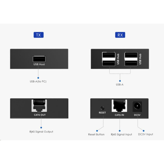 PremiumCord 4-port USB 2.0 extender po Cat5/Cat5e/Cat6 do 150m USB 2.0 extender reprezentuje další skok na poli prodloužení USB 2.0/1.1 zařízení do vzdálenosti až 150m. Tento extender překračuje omezení maximální vzdálenosti USB 2.0 kabelu 5m a umožňuje zapojit všechny USB periferie až do vzdálenosti až 150m. Pomocí levného kabelu Cat5/Cat5e/Cat6 se dosáhne ekonomického a efektivního řešení. Nyní můžete umístit vaše kamery, tiskárny, webové kamery, klávesnice/myši nebo jiné USB zařízení tam kam vy opravdu chcete. - Vysílá USB signál přes Cat5/Cat5e/Cat6 kabely až na vzdálenost 150m. - Skládá se ze dvou částí: vysílače a přijímače, které se navzájem propojí kabelem s konektory RJ-45 - Nesmí se zapojovat do aktivní počítačové sítě - ethernet, s aktivními prvky jako jsou switche a routery. - Podporuje zařízení USB 2.0 a je zpětně kompatibilní s USB 1.1 (low-speed, full speed) až do vzdálenosti 150m přes Cat 5/Cat5e/Cat6 kabely. - Podporuje připojení až 4 USB zařízení na vzdálené straně extenderu. - Extender používá na propojení vysílače a přijímače patch kabel Cat5/Cat5E/Cat6 , tento kabel není součástí balení. - K napájení se použije přiložený power adaptér 230V/5V 1A - Ideální pro různé USB zařízení jako tiskárny, webové kamery, pevné disky, mobilní telefony, iPod, digitální kamery a hrací konzole. - Řešení pro spojení USB na dlouhou vzdálenost - Elegantní řešení pro natažení dlouhého kabelu USB třeba mezi několika místnostmi - Skutečná dosažitelná rychlost přenosu dat přes zařízení na 150m je až cca 7 MB/s (cca 50 Mbps), otestováno Obsah balení: - 1 x lokální extender konektory: USB typ A Male, RJ45 Female - 1 x vzdálený extender konektory: 4xUSB typ A Female, RJ45 Female, konektor pro napájení - 1 x napájecí adaptér 5V 1A - 1 x USB propojovací kabel A/M - A/M Systémové požadavky: - USB2.0 Port - Windows XP, Windows Vista, Windows 7, Windows 8/8.1, Windows 10.