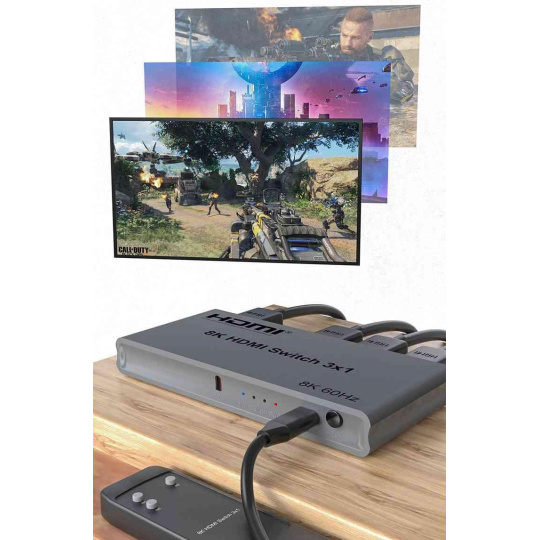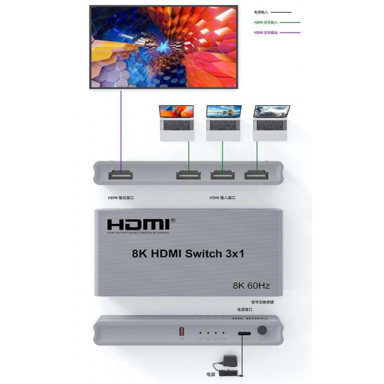 3 HDMI zařízení na vstupu sdílejí 1 výstupní monitor, projektor. Výběr vstupních zařízení: 1.automaticky, 2.stisknutím tlačítka na čele přepínače, 3.dálkovým ovladačem