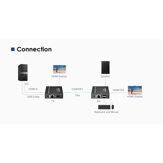 Umožňuje distribuovat HDMI signál o vysokém rozlišení 4K@60Hz bez zpoždění až na 70 metrů a přenášet zároveň USB (například klávesnici, myš nebo jiné USB periferie)