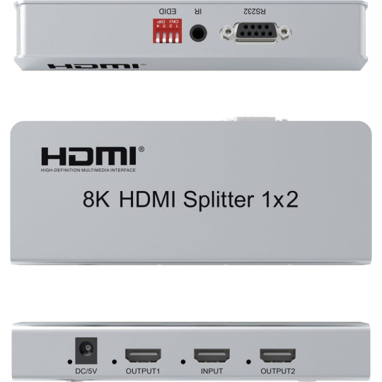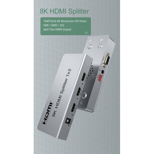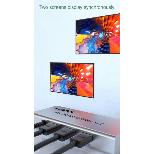 Splitter podporuje HDMI signál s rozlišením až 8K@60Hz, 4K@120Hz nebo FULL HD 1080p