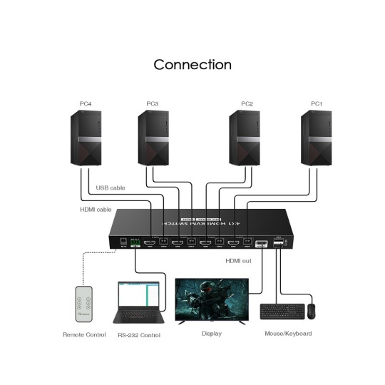 KVM přepínač umožňuje zapojit až 4 servery nebo PC a ovládat jednoduše pomocí HDMI monitoru a USB klávesnice a myši.