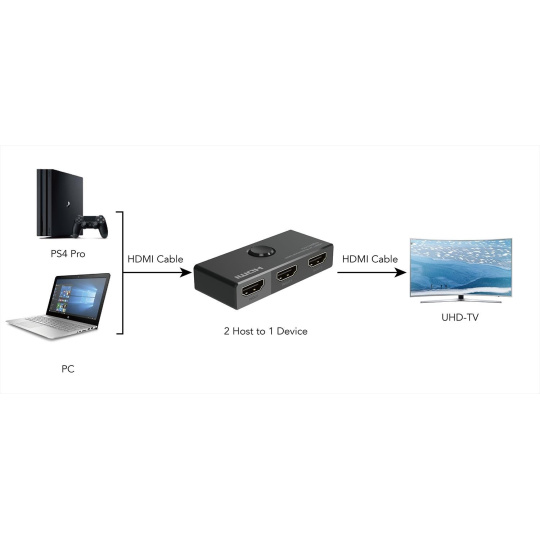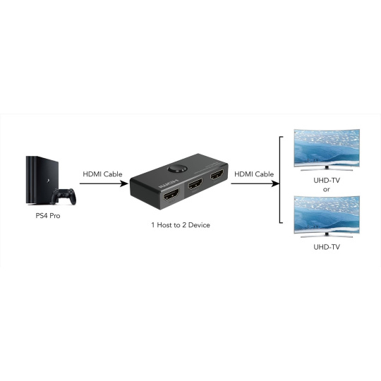 2 HDMI zařízení sdílejí 1 HDMI obrazovku nebo přepínač z jednoho zdroje HDMI signálu přepíná na dva monitory (vždy se zobrazuje obraz pouze na jednom z monitorů). Výběr zařízení je tlačítkem na přepínači.