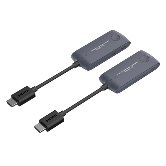 - Vysílací a přijímací adaptéry mají krátký HDMI kabel pro snadné zapojení do počítače a zobrazovače nebo TV.