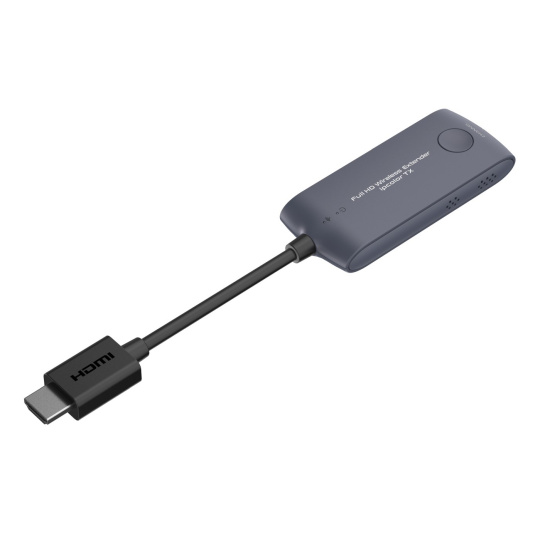 - Vysílač představuje malý dongl, který se zasune přímo do konektoru HDMI počítače, notebooku. Vysílač je napájen pomocí USB kabelu z USB portu.